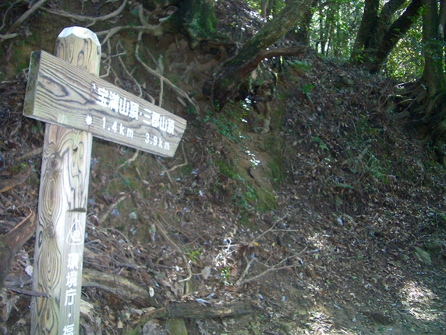 右手へカーブし登って行くと、左手に道標が立てられ「宝満山:1.4km 三郡山:3.9km」と案内されている。