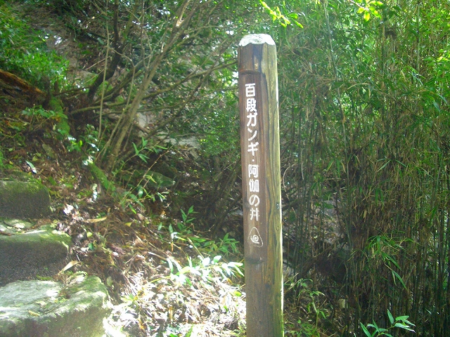 その先には、木柱が立てられ「百段ガンギ 閼伽(あか)の井」と書かれている。