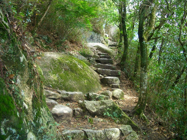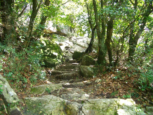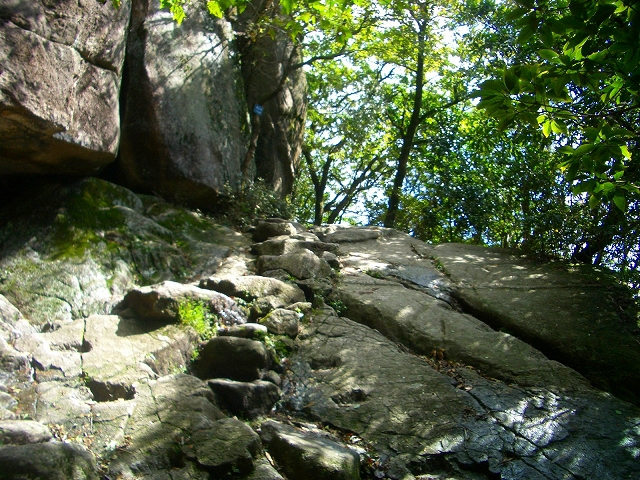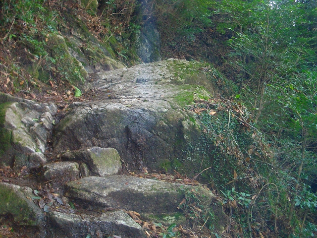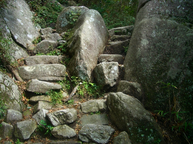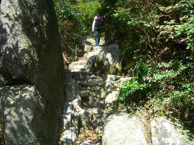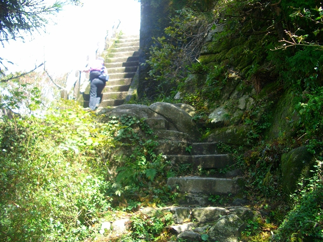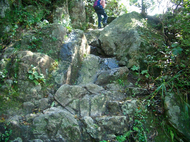 すぐ急な石段を登り、さらに岩場を登っていく。