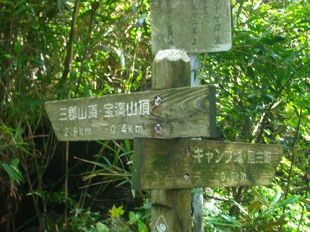 が立てられ、直進の道は「三郡山頂:2.9km 宝満山:0.4km」 そして右手は「キャンプ場・座主跡:0.6km」と案内されている。
