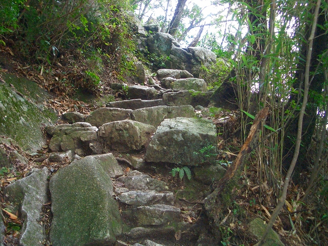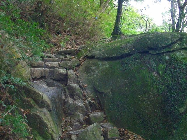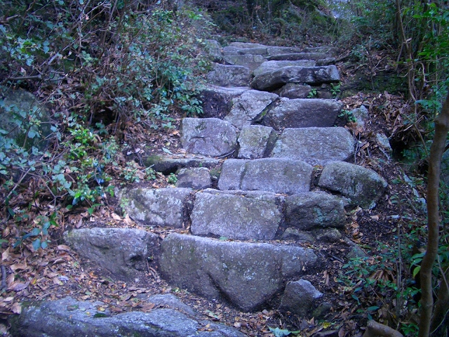 段差が大きい石段を左手へカーブし登って行くと、1列に積まれた石段は、