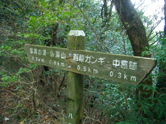 が立てられ、「宝満山頂:0.3km」そして後ろは「百段ガンギ:0.5km 中宮跡:0.3km」 と案内されている。