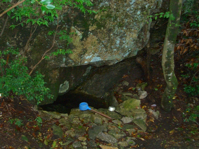 は、大きな岩の基部の割れ目にあり、林に隠れて薄暗い。