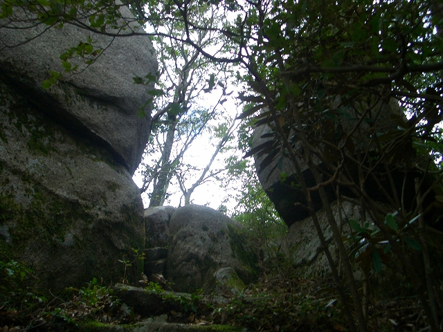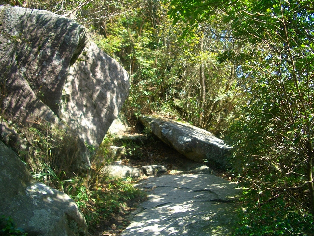 羅漢めぐりを経て山頂へ達するこのコースは、巨岩に沿って道は伸びていく。