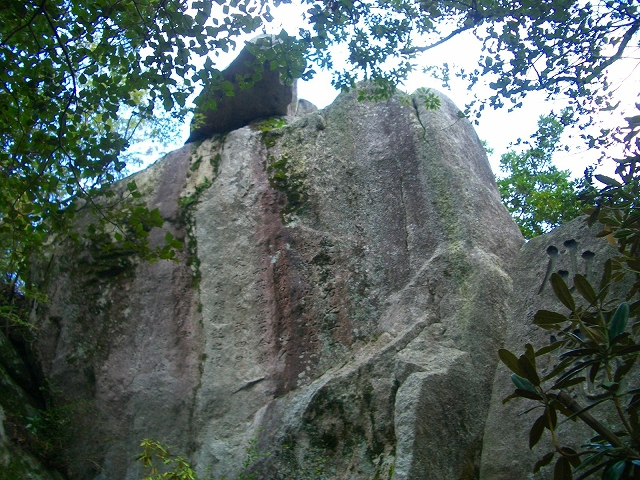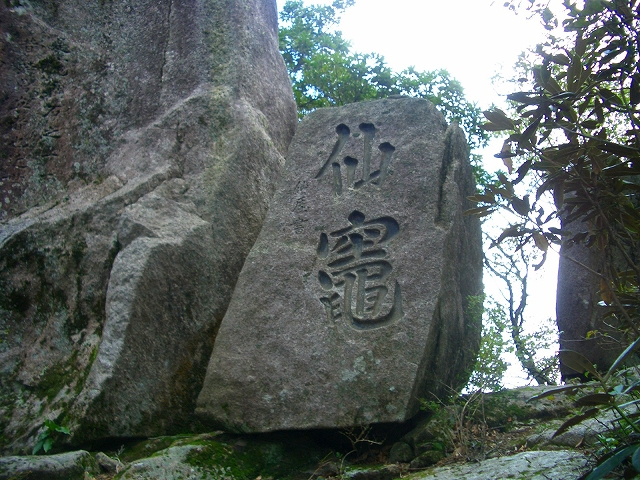 石段を登り、さらに岩場を登ると、正面に文字が書かれた岩が目に付くが、文字ははっきりしない。
