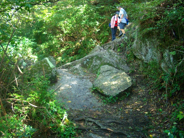 この岩を下るとすぐ石段になる。