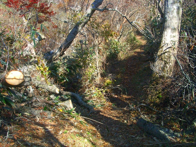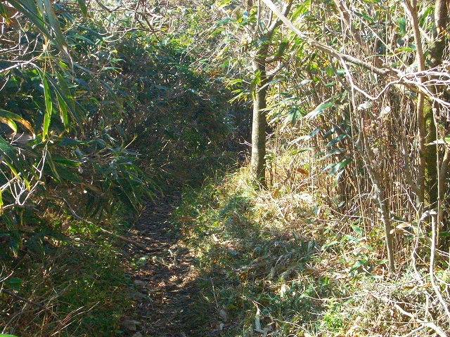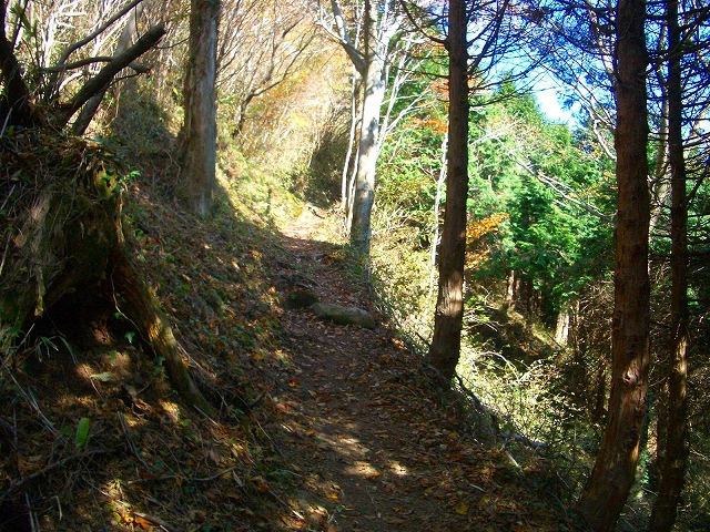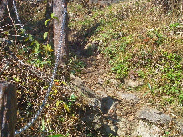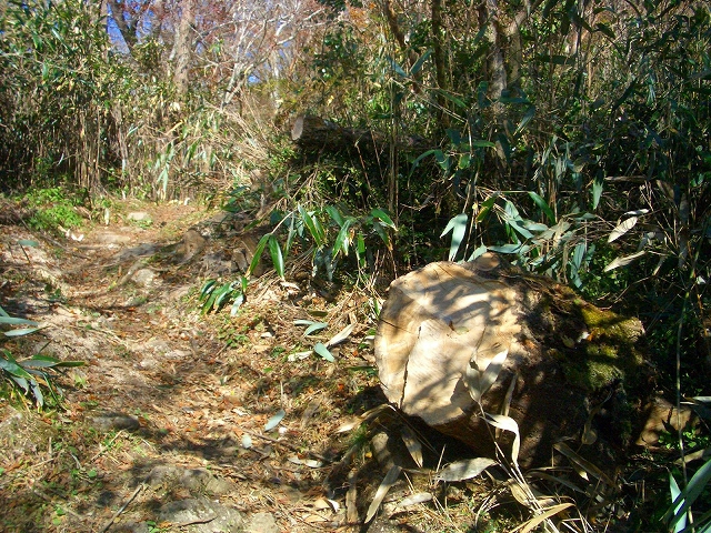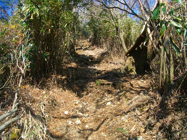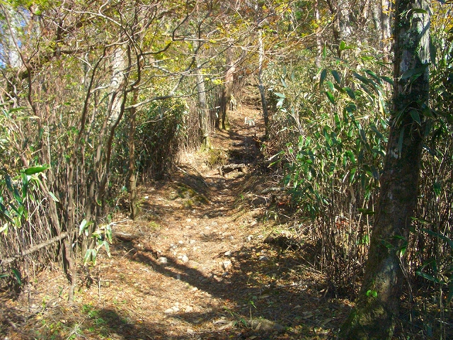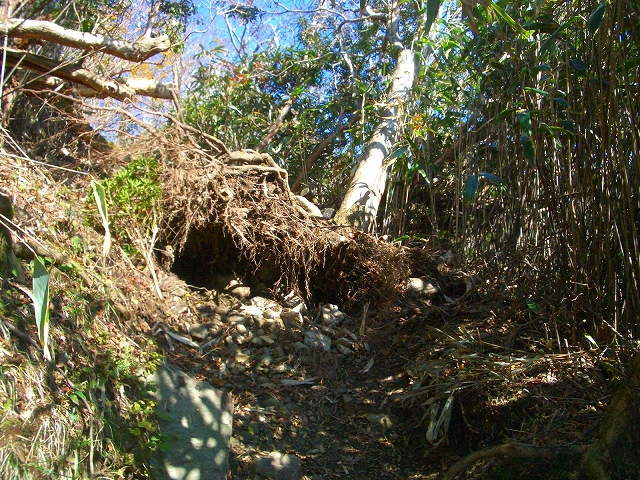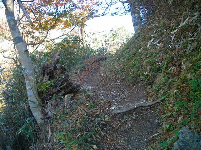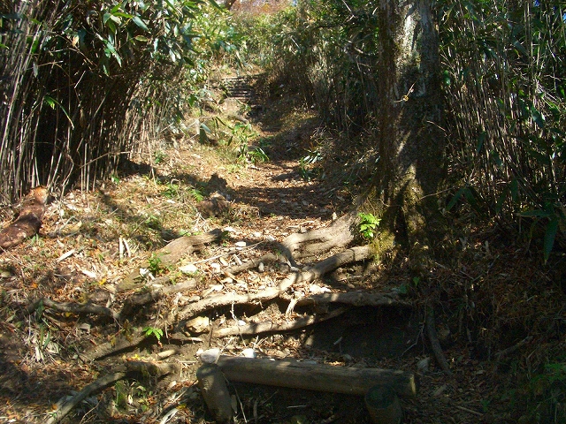 踏み跡は、その右手に付けられ、少し登ると木の根の多い急坂になり、10メートルも登るとゆるやかに下りだす。
