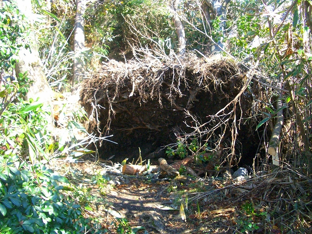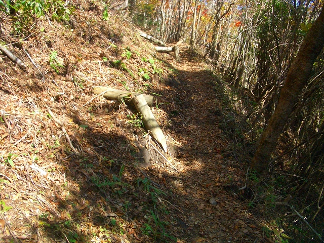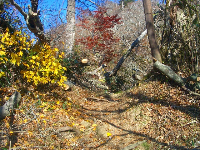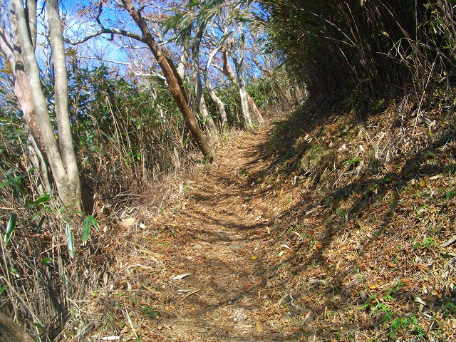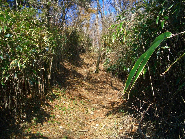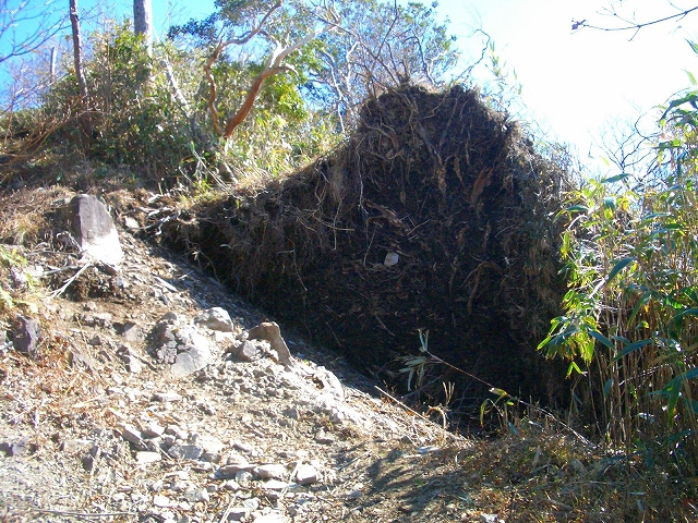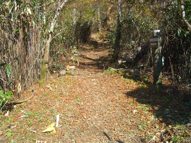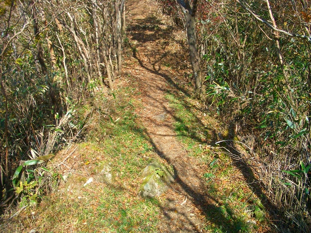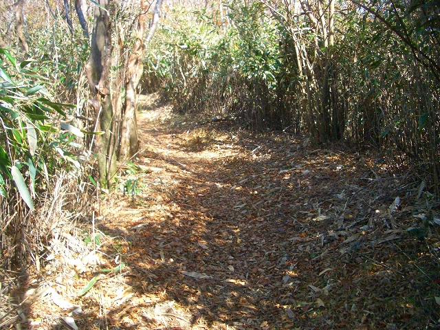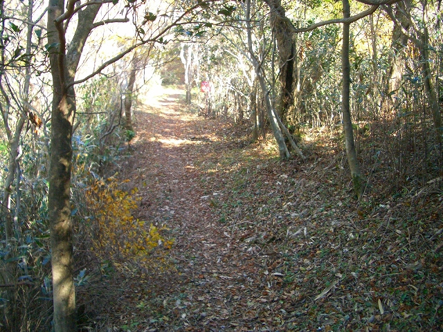 踏み跡は、その右手に付けられ、少し登ると木の根の多い急坂になり、10メートルも登るとゆるやかに下りだす。