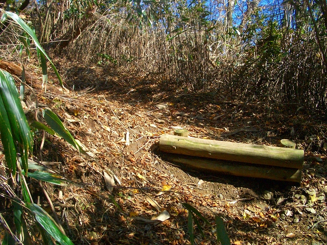 木段は、斜面から抜け出したように、右手半分は浮いた状態で、その役目は果たしていない。