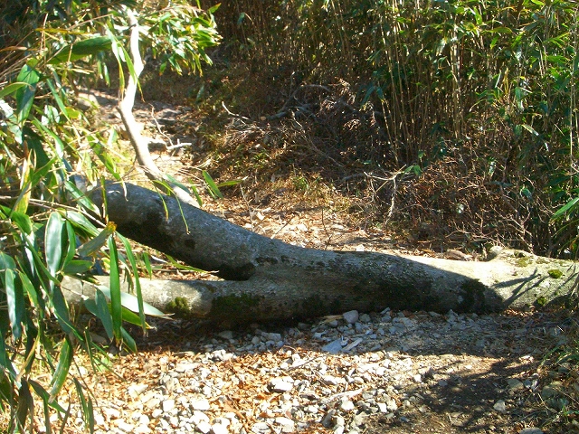 左手にも、同じ木の下部がスズタケの林の中に倒れている。