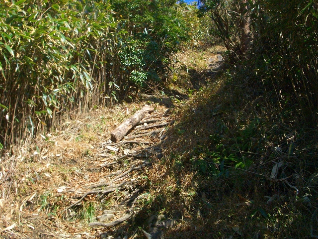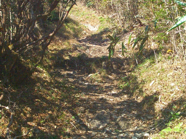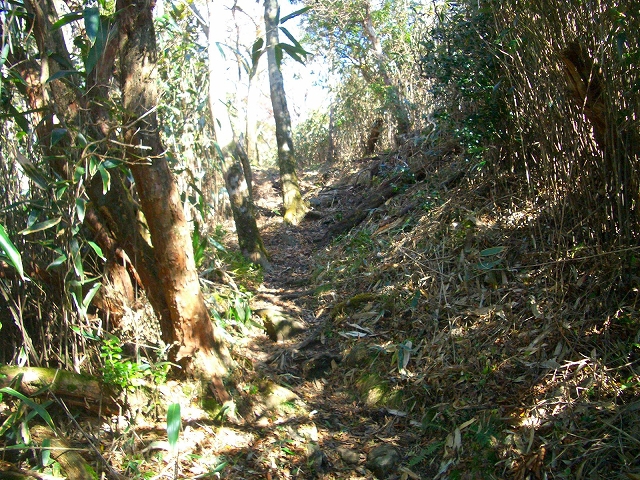 さらに急坂を右手へ鋭角にカーブし、表土が雨水に流されたようなミゾ道を登っていく。