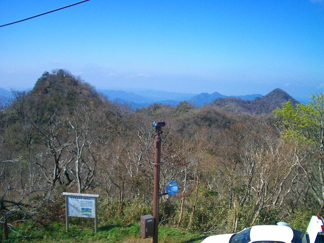 三叉路から3〜4分で展望所駐車場に着く。 展望所には、釈迦岳風景林や釈迦岳雨量観測局の説明板が立てられている。