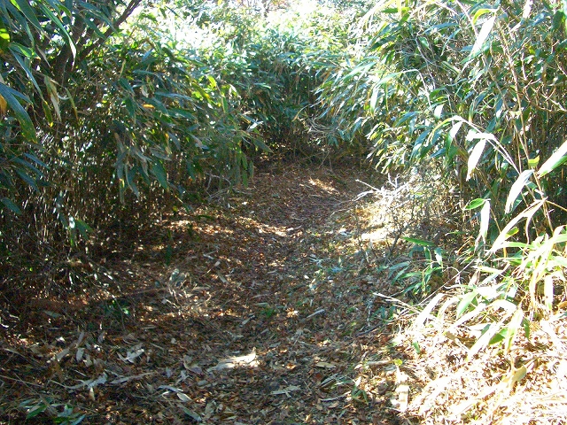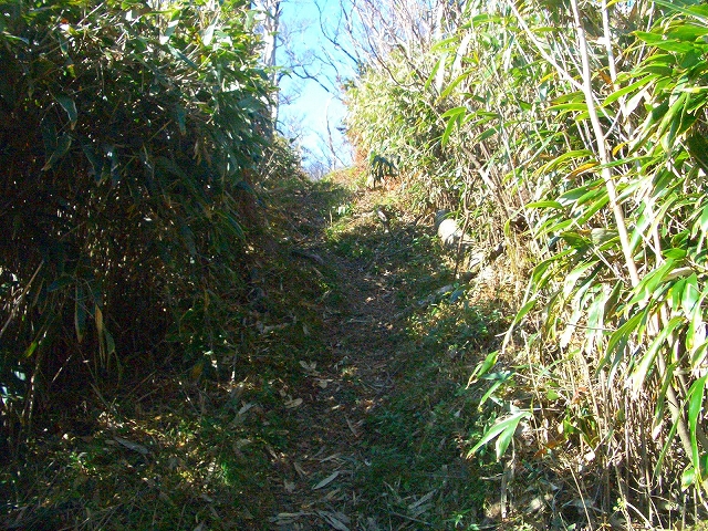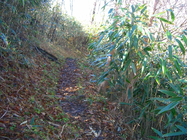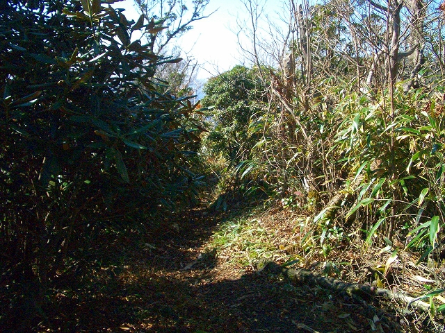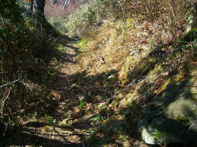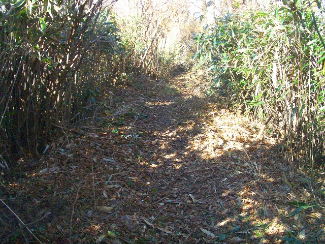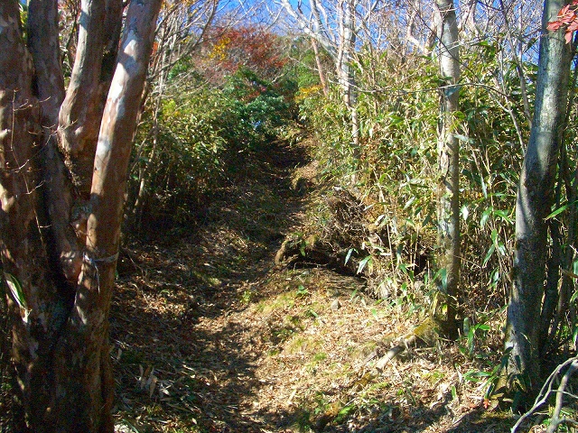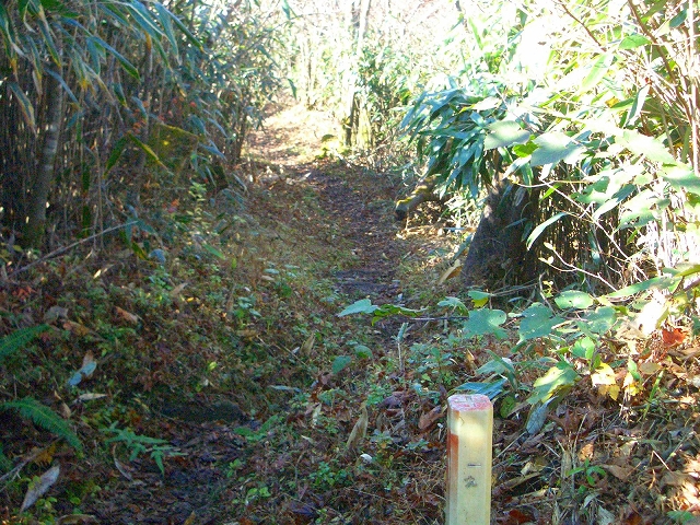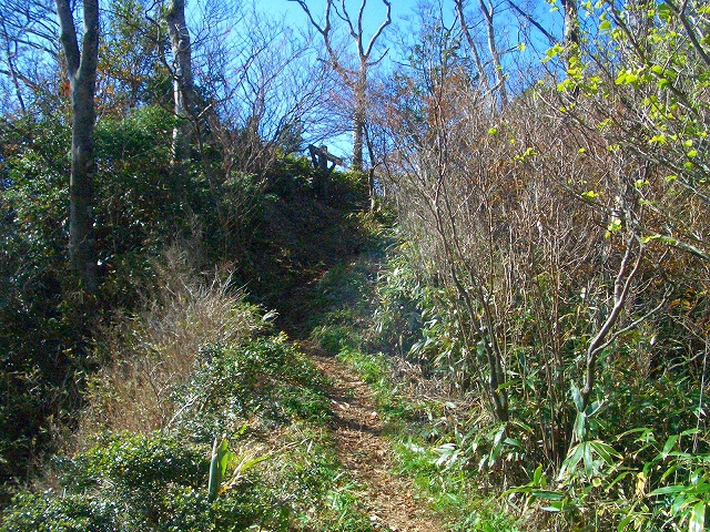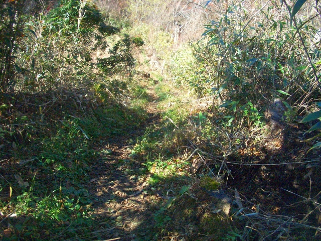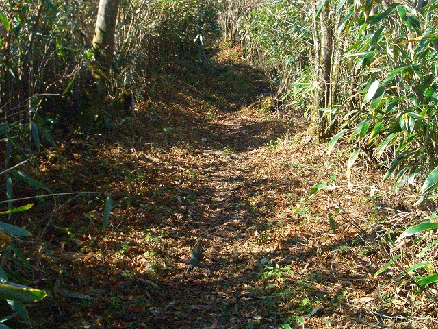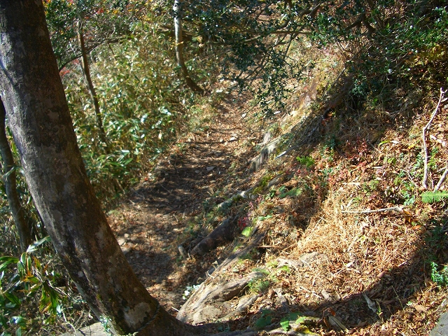 尾根筋の道を右手へカーブし、尾根の右手斜面へ移り、狭い道をゆるやかに下っていく。