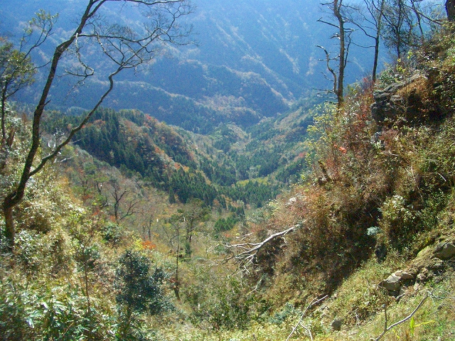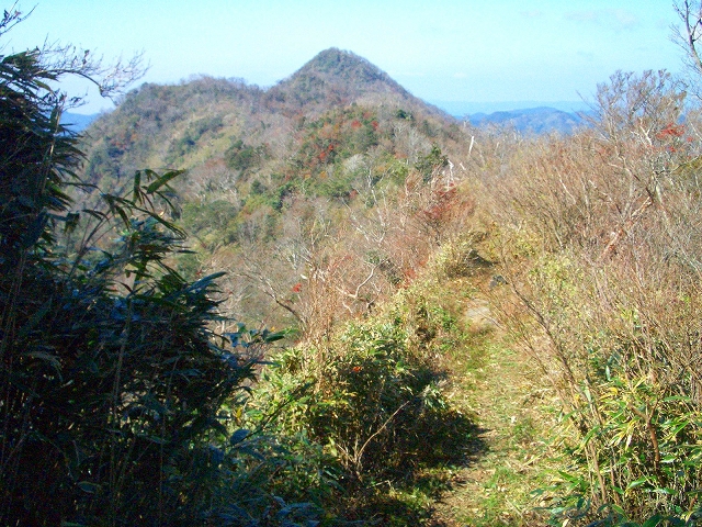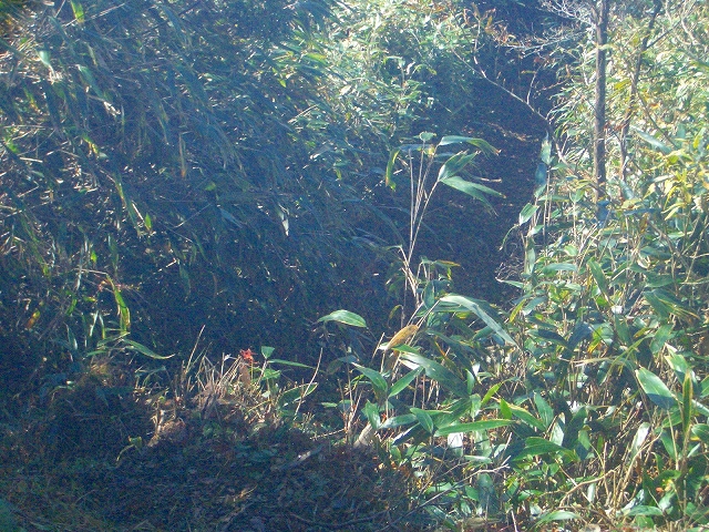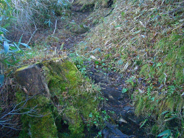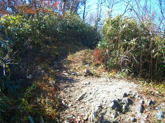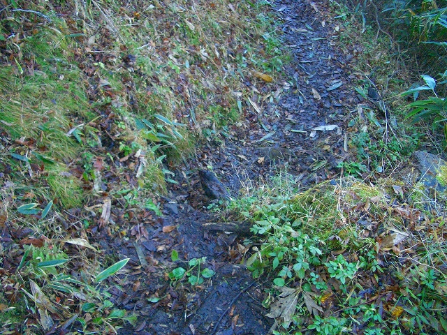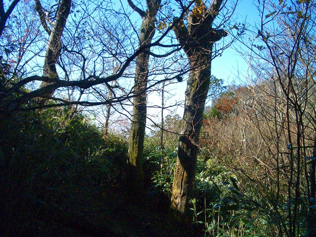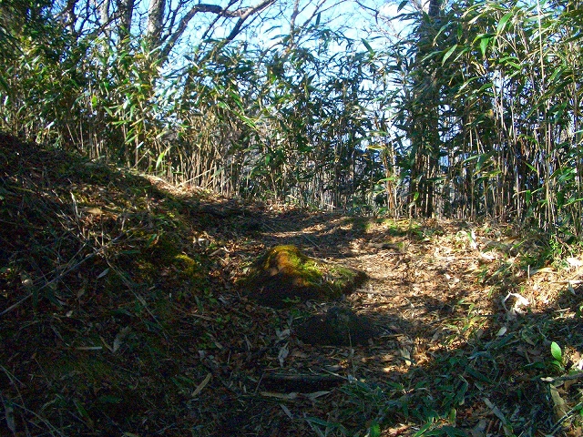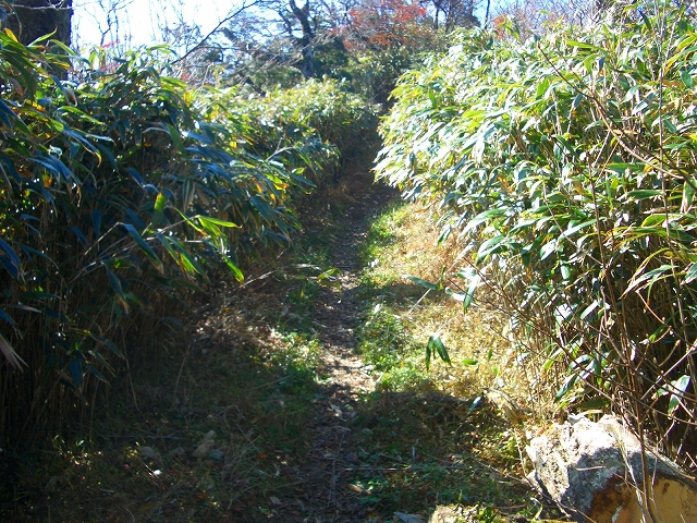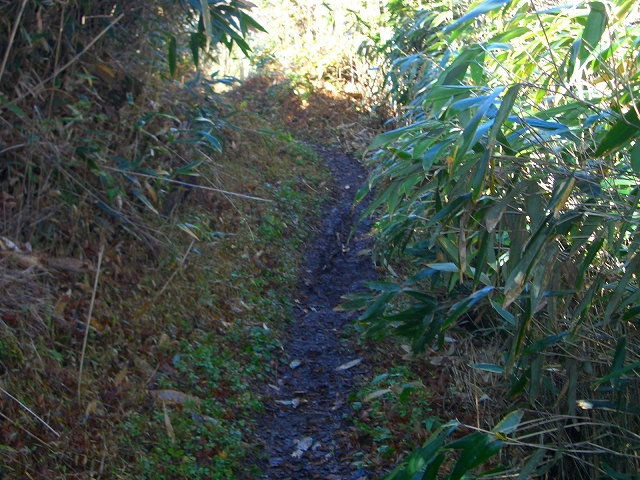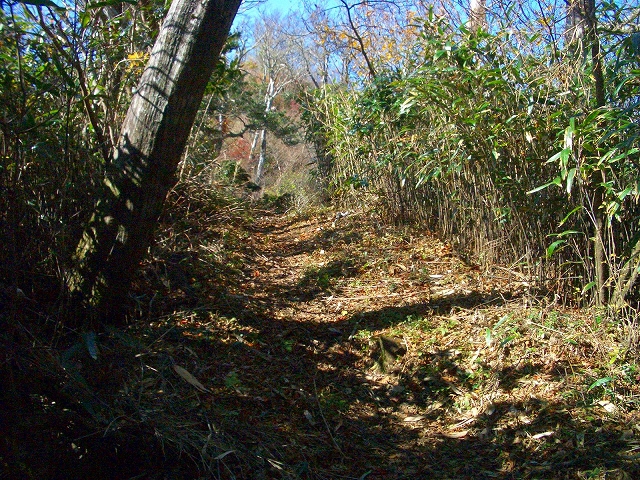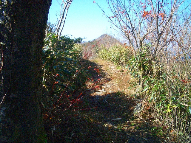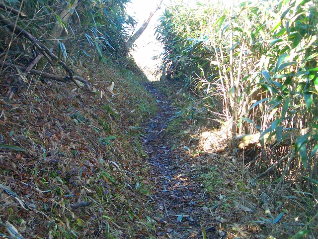 尾根筋の道を右手へカーブし、尾根の右手斜面へ移り、狭い道をゆるやかに下っていく。