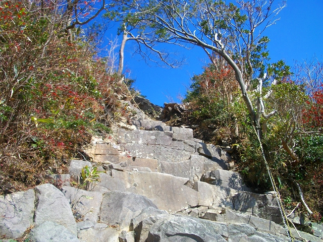 右手には、結び目があるトラロープが張られ、ここを降りさらに急坂を右手へ下っていく。