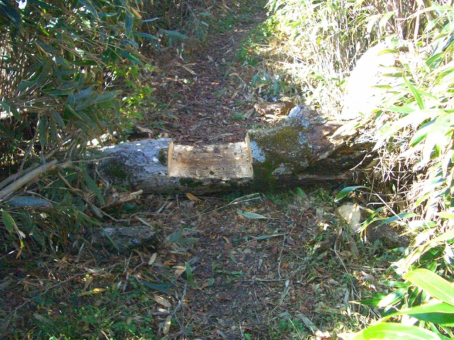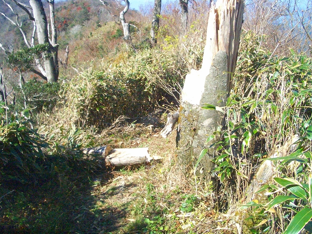 右手には、立ち枯れた木が途中で折れ、道に落ち歩行の障害になっているが、この枯れ木は道幅だけ切り抜いてある。