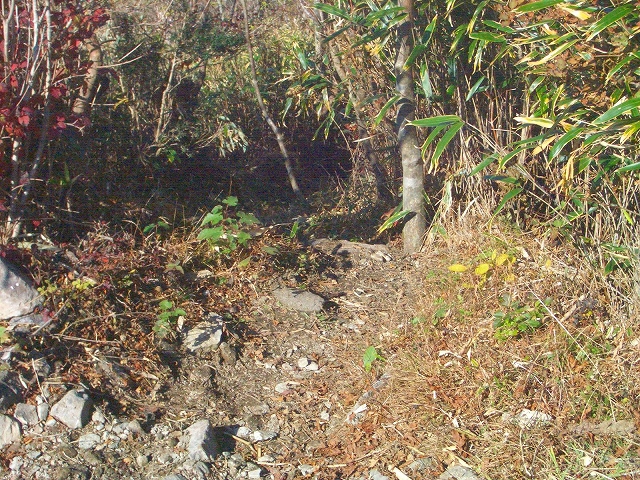 途中1メートルほどのコケむした岩の段差を降り、ゆるやかに左手へ下っていく。