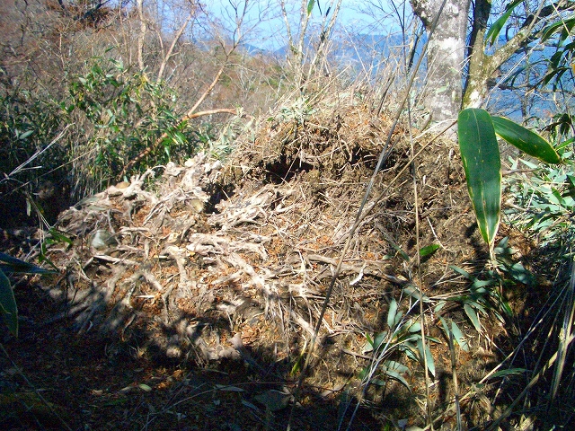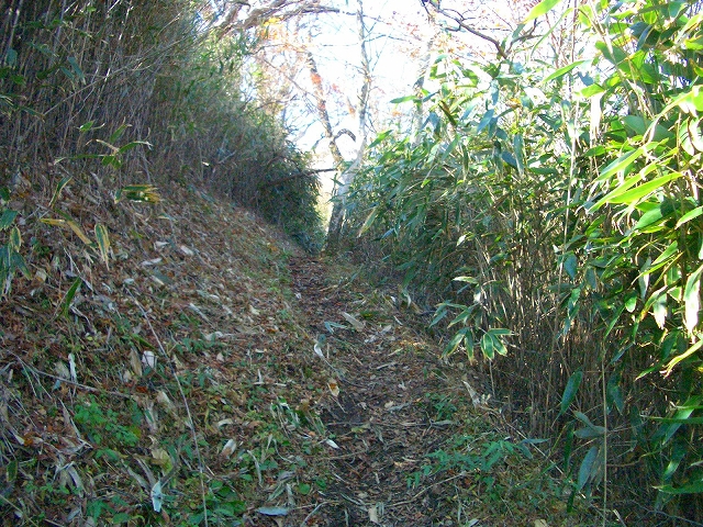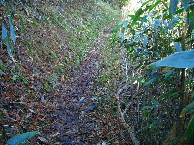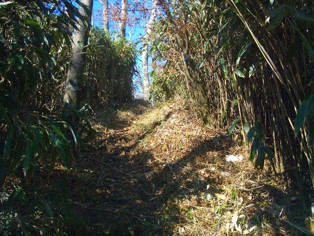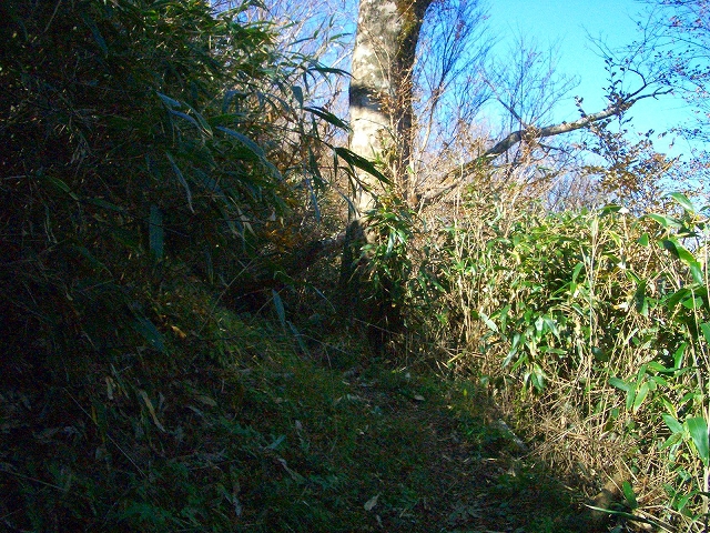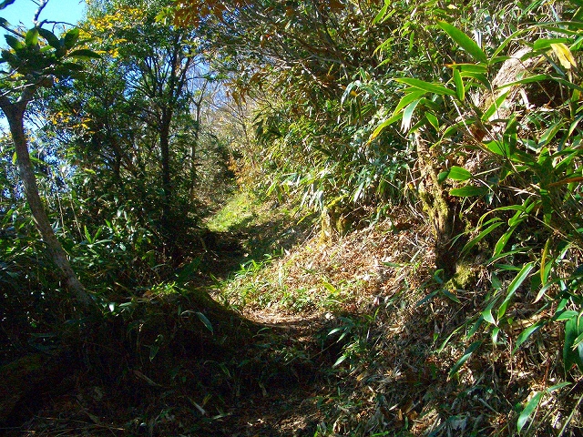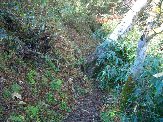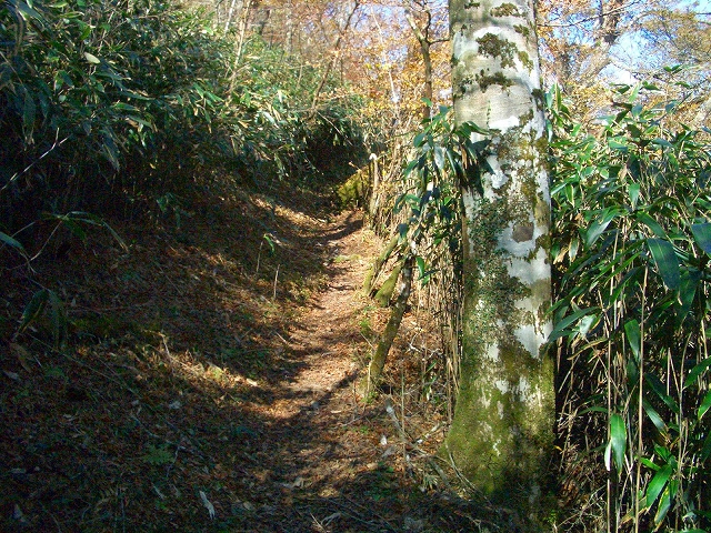 スズタケの道をゆるやかに登って行くと、左手斜面の1メートルほど高いところに