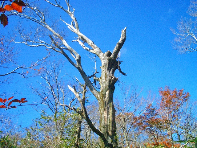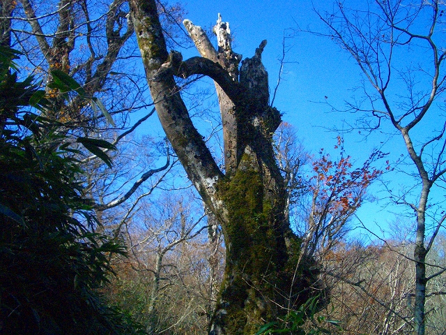 すぐ正面のコケに覆われ枯れた立ち木をよけながら、左手をゆるやかに登って行く。