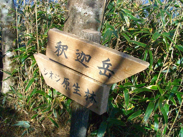 ここには標柱が立てられ、後ろを「釈迦岳」右手を「シオジ原生林」と案内され、釈迦岳へ向かう登山者向けに立てられている。