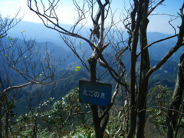 山頂から2分足らず下だって行くと、左手には「えごのき」と書かれた樹名板が幹にかけられている。