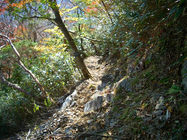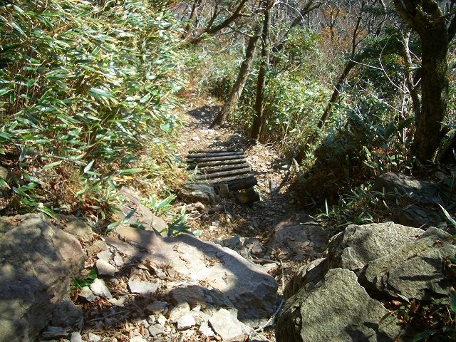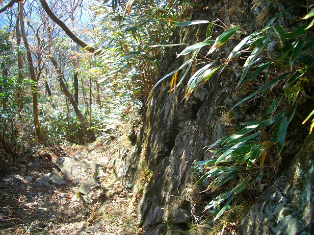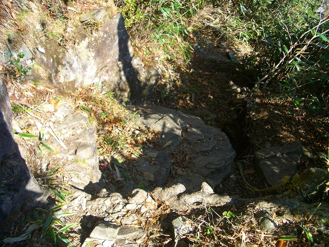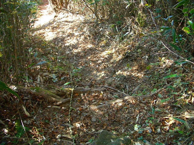 ここには、大きな結び目を付けたトラロープが垂らされ、急坂を1分も下ると、道には露岩が多くなる。