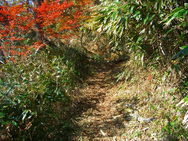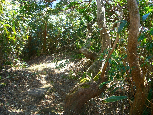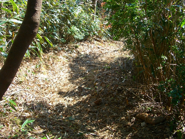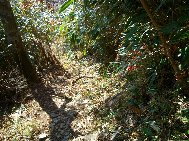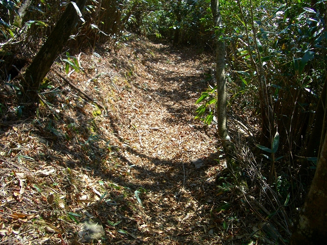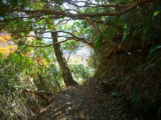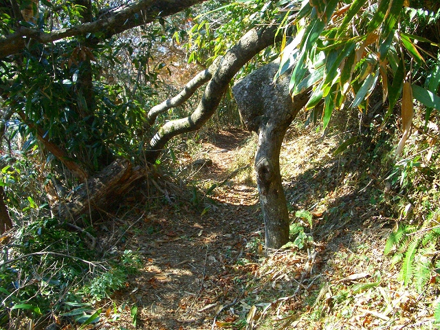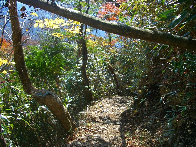 すぐ枯れた倒木の段差を降り、左手へカーブし狭い斜面の道を下る。