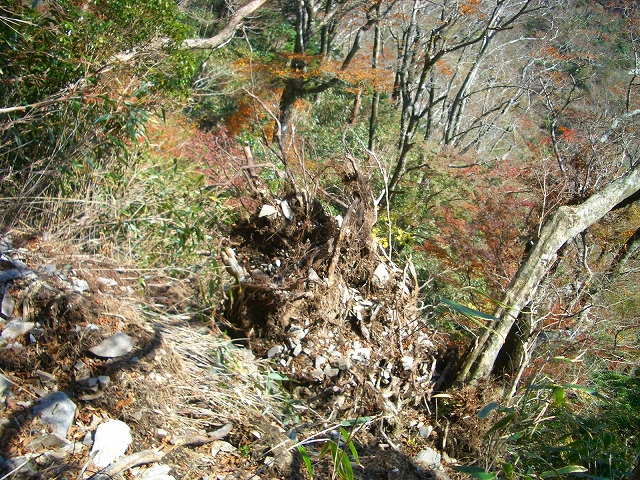 倒木が表土や小石を包み込んで根元から左手斜面へ落ち込んでいる