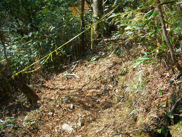 この辺りも小石が多く滑りやすい。 すぐ右手にカーブすると、正面に黄色のテープが張られ、その手前から左手へ急坂を下っていく。