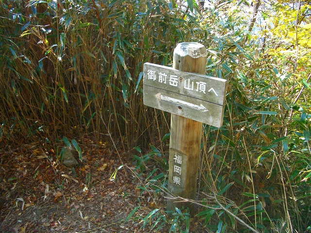 正面右手には、案内板が立てられ「御前岳山頂へ」と案内され、ここから左手へ急坂を下る。