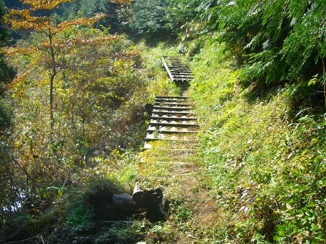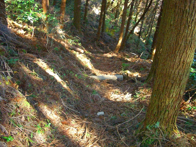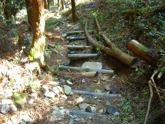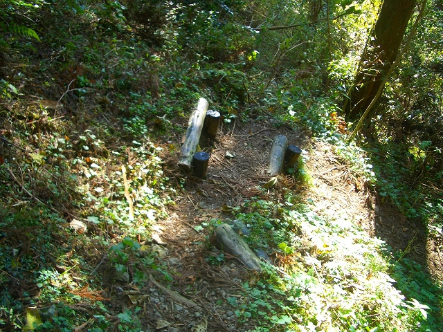 すぐ右手へカーブし急坂を下っていくと、そこには数段の木段が付けられているが、別に踏み跡が付けられている。