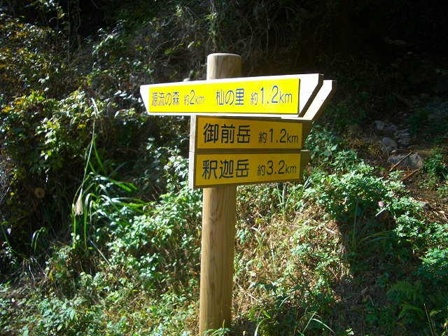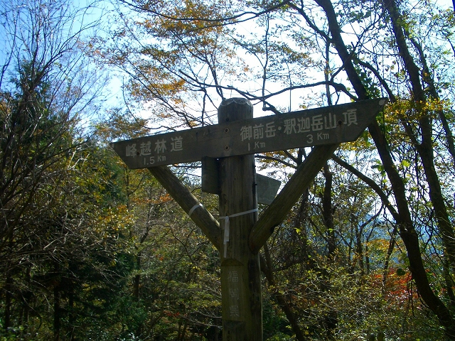 道標には「峰越林道:1.5km 御前岳:1km 釈迦岳山頂:3km」。