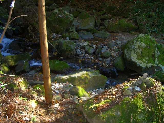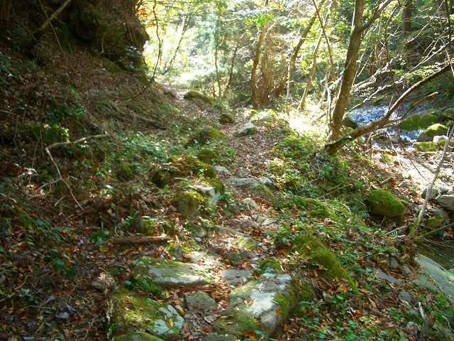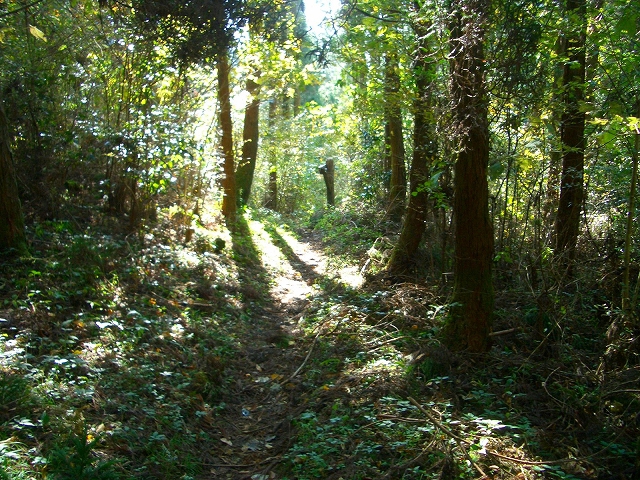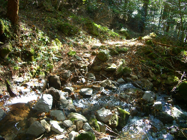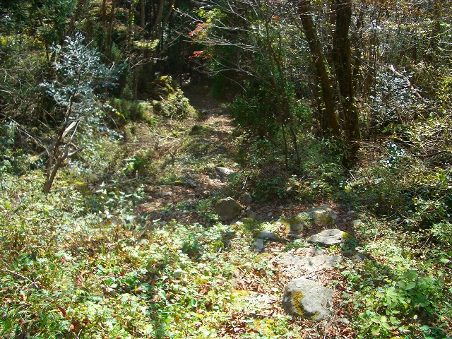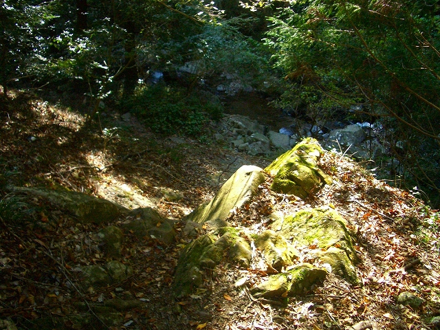 道には岩が多く歩きづらい。 スギと自然林が混在する薄暗い道を1〜2分も下っていくと、天井が開け明るくなる。