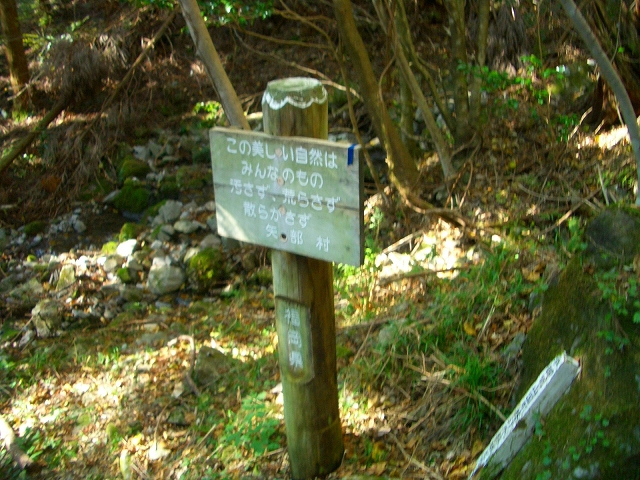 すると右手に案内板が立てられ「この美しい自然 みんなのもの 汚さず荒らさず 矢部村」と書かれている。