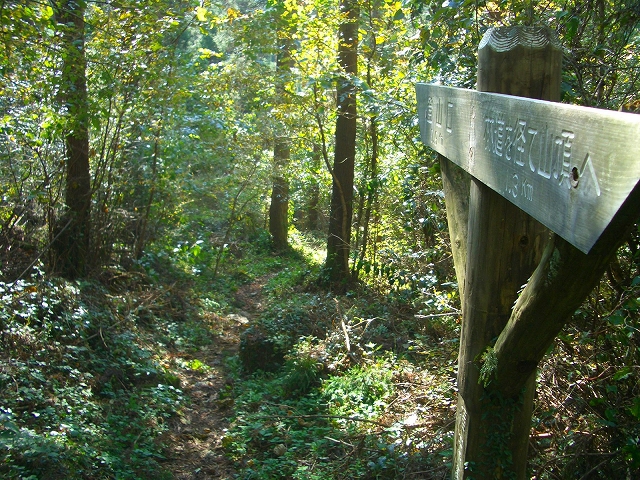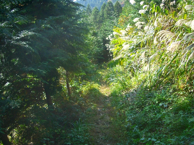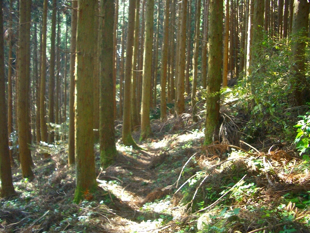 少し下ると傾斜はゆるみ、スギと自然林が混在する道をゆるやかに下っていく。