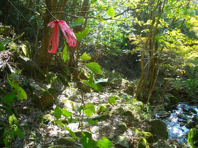 さらに、赤いリボンを見て岩の多い道を下っていく。