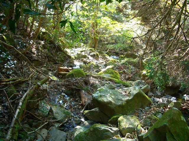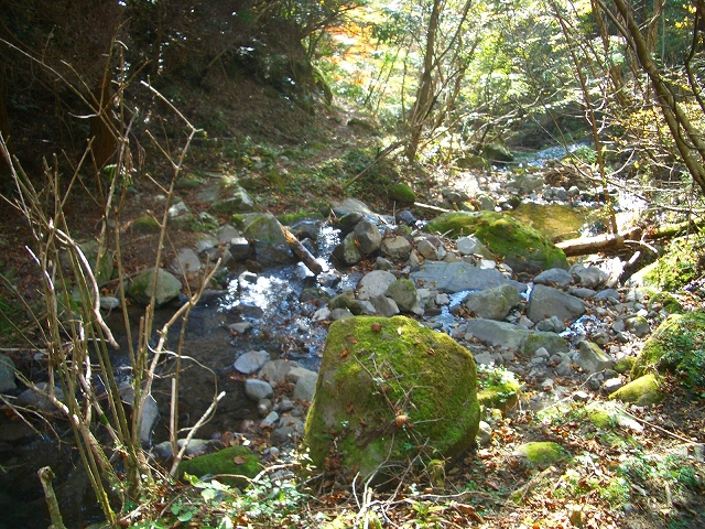 用心して岩場を降りると、正面は沢が流れここを左手へカーブし下っていく。