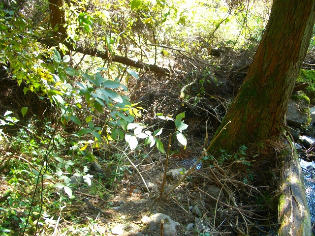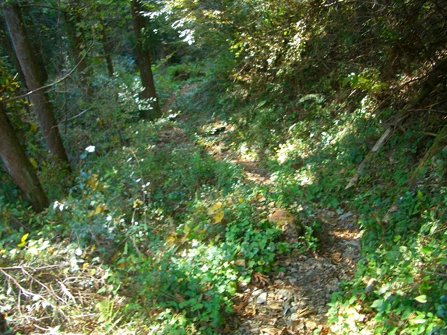 狭い下草の多い道をゆるやかに下っていくと、小さな水路を2箇所ほど渡っていく。