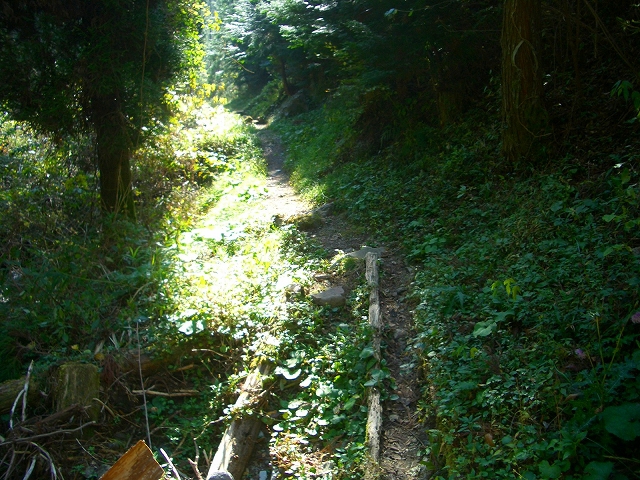 道の左手は所々欠落している。 そこには路肩補強に丸太が敷かれているが、その木も腐り始めている。