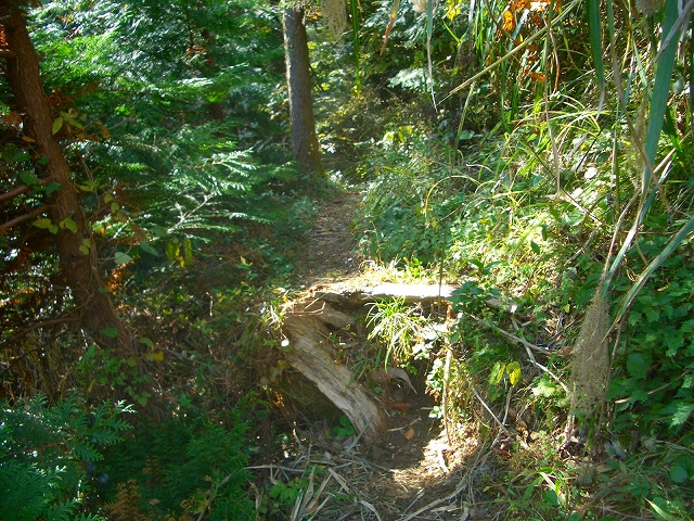木の根の段差から2分足らず下り、スギの倒木をくぐっていく。
