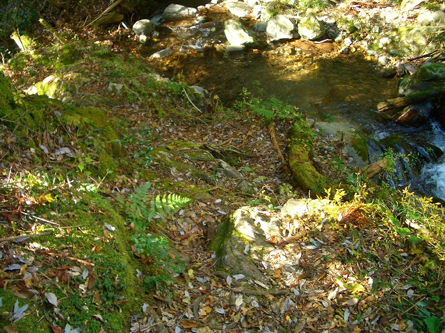 沢を渡り、右手へ向きを変え沢の左手を少し登り、すぐゆるやかな下りを行く。