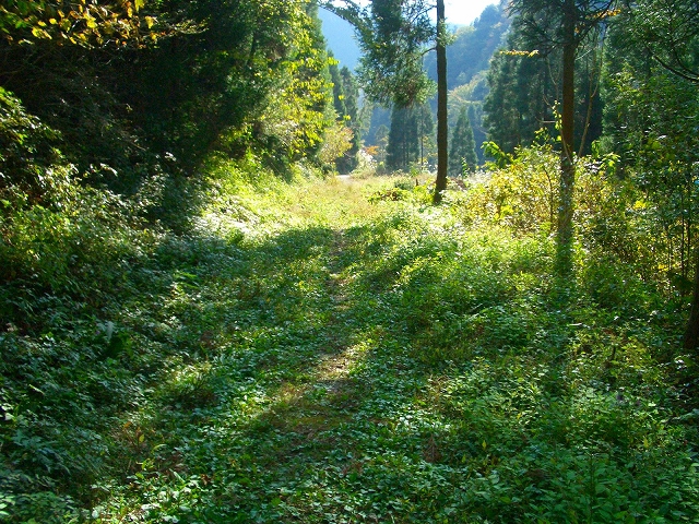 ほぼ平坦な道を蛇行し、一塊のスギ林を左手へ抜けていく。