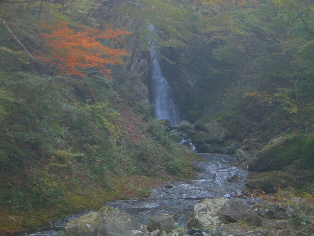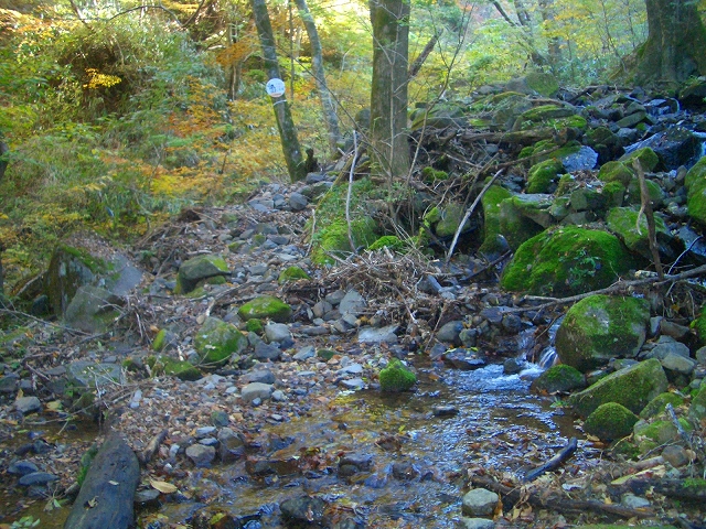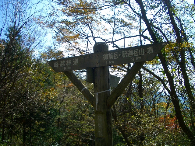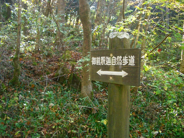 No.1 駐車場、宿泊者専用と案内されているが「登山者は奥の方から止めてください」との要請有り。No.2 吊橋。No.3 水のカーテン。No.4 八ツ滝。No.5 登山道入口。No.6 沢を渡る、岩道を行く。No.7 案内板、御前、釈迦自然歩道。No.8 落ち葉の狭い道。No.9 コンクリート堰。No.10 林道出会い、釈迦岳1.2km、御前岳3.2km。No.11 石道、コケむした岩の上の小石は壊れたケルンの跡か。No.12 釈迦岳登山口、林道を数回横切ると登山口に着く。釈迦岳0.9km。No.13 木段。No.14 急坂は休むが一番。No.15 平坦な道。No.16 変わり者の木。No.17 台風の爪あと。No.18 階段はバランスをとるのが難しい。No.19 倒木。No.20 分岐、右手展望台へ。No.21 釈迦岳レーダー観測局展望台。No.22 岩道、山頂への最後の急坂。No.24 釈迦岳山頂。山頂は狭い。釈迦如来坐像、造形は悟りの境地を現す姿だという御前岳:2km。No.24 岩場、用心・用心。No.25 倒木。No.26 御前岳。No.27 釈迦岳。No.28 岩場。No.29 やせ尾根。No.30 道標 御前岳:0.8km。No.31 シャクナゲ。No.32 大木、御前岳の中間辺りから大木が多くなる。No.33 分岐、山頂は直進、右手はシオジ原生林を経て田代登山口へ通じる。No.34 御前岳山頂、近年山頂周りが刈り払われ展望はいい。No.35 釈迦岳の岩峰が小さく見える。No.36 急坂の連続。No.37 岩場もある。No.38 スギ林を下る。No.39 林道出会い、左折する。No.40 道標、林道を200m程歩くと道標、右手へ下っていく。No.41 スギ林の道。No.42 草道。No.44 駐車場。