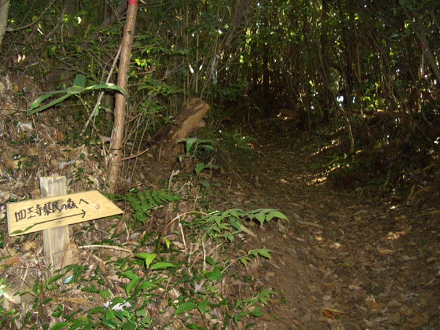 すぐ、左手の幹に白い文字板が掛けられ、行く手を「四王寺」と案内している。