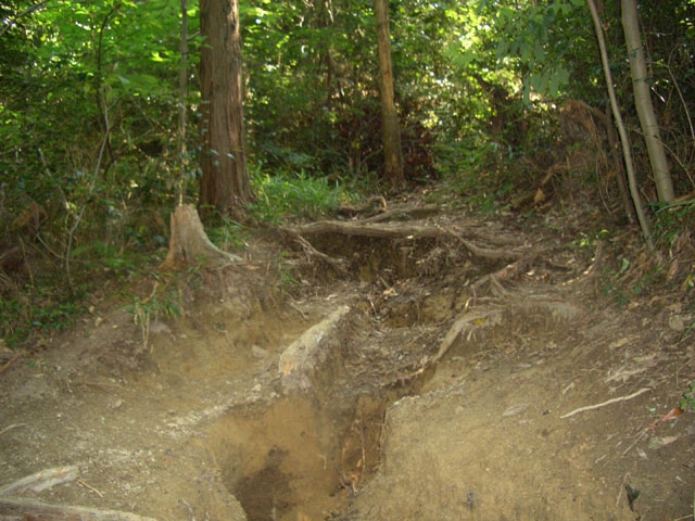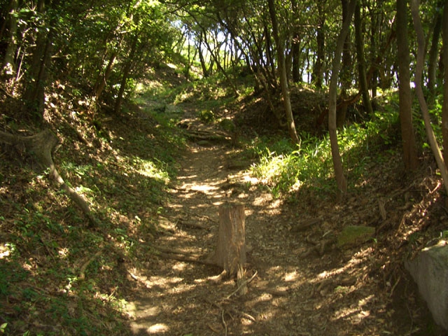 足元の岩をよけ、10m余り行くと高さ50センチメートルほど残された切り株が道の真ん中に突き立ち、わき見すれば転びかねない。
