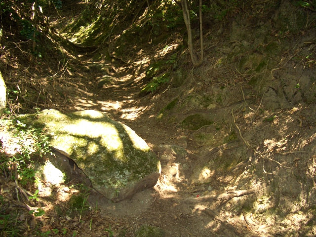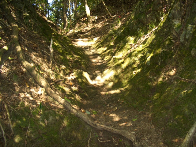 ミゾ状の道の両壁の岩もコケむし深緑色に変色している。