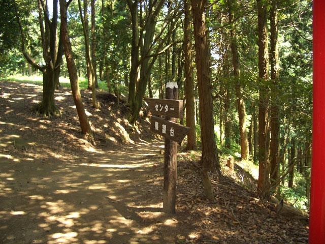 行く手の道を確認するため、赤い鳥居をくぐると、右手に道標が立てられ行く手を「センター」と案内され、ヒノキ林の中に気持ちのよさそうな道が伸び下っている。