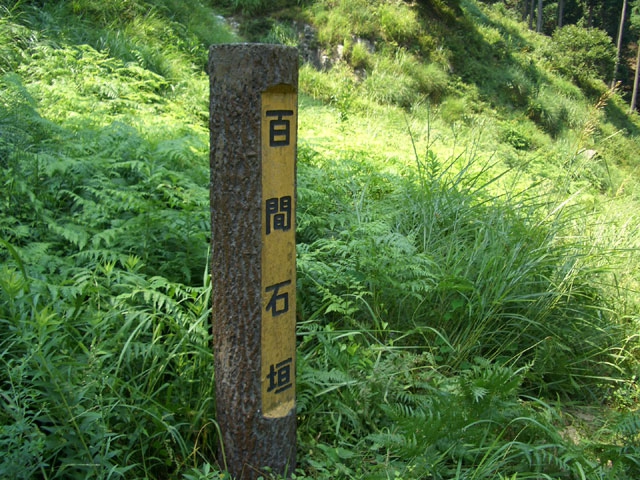 少し行くと左手に擬木の石柱が立てられ「百間石垣」と書かれている。