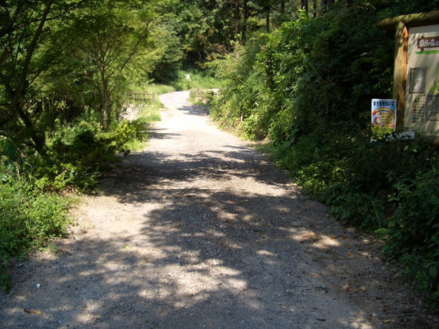 橋を渡ると、すぐ右手に「県民の森案内絵図」を見て車道を登って行く。