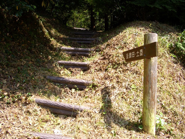 が立てられ「至勝田・土塁」と案内され擬木の階段が付けられている。
